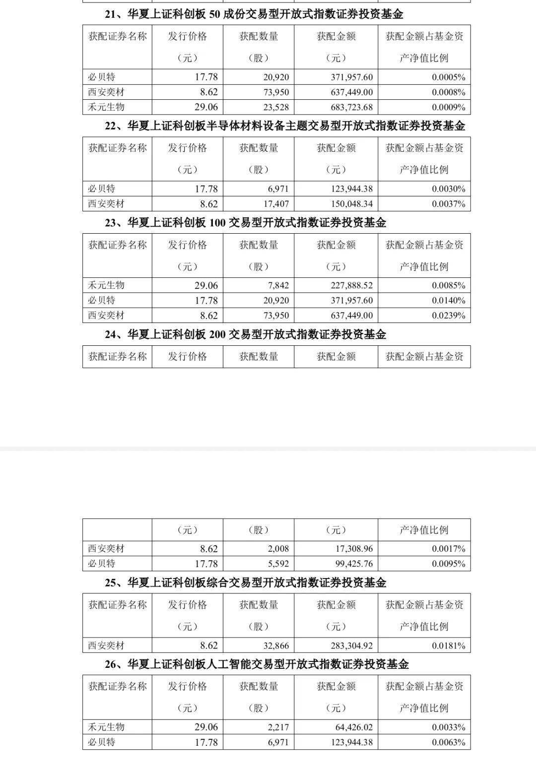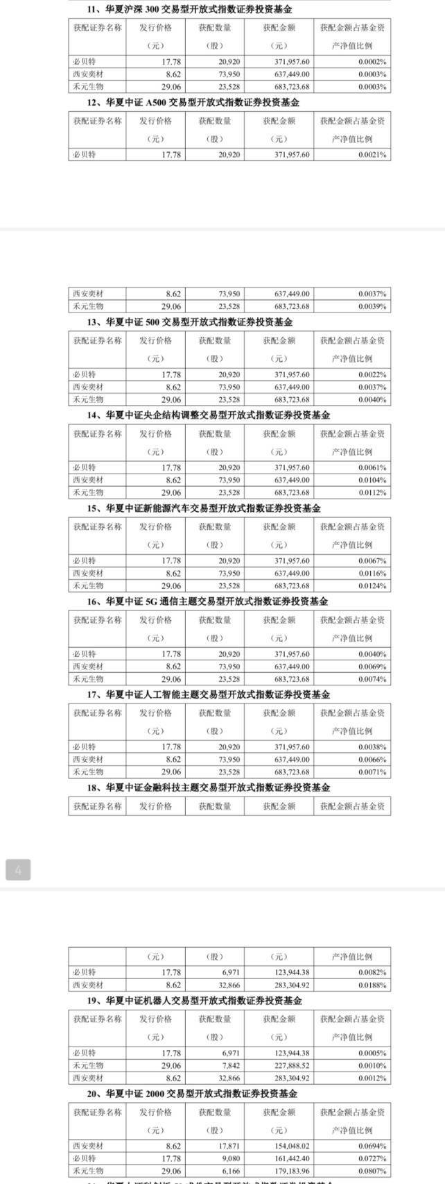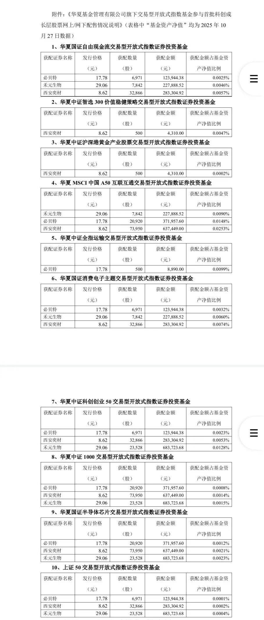 Wind数据显示,除了华夏基金旗下产品之外,还有包括南方中证500ETF、万家中证A500ETF、富国中证A500ETF、华泰柏瑞沪深300ETF等在内的超160只ETF及联接基金参与了和元生物的网下配售;超200只ETF及联接基金参与了西安奕材网下配售;超250只ETF及联接基金参与了必贝特的网下配售。