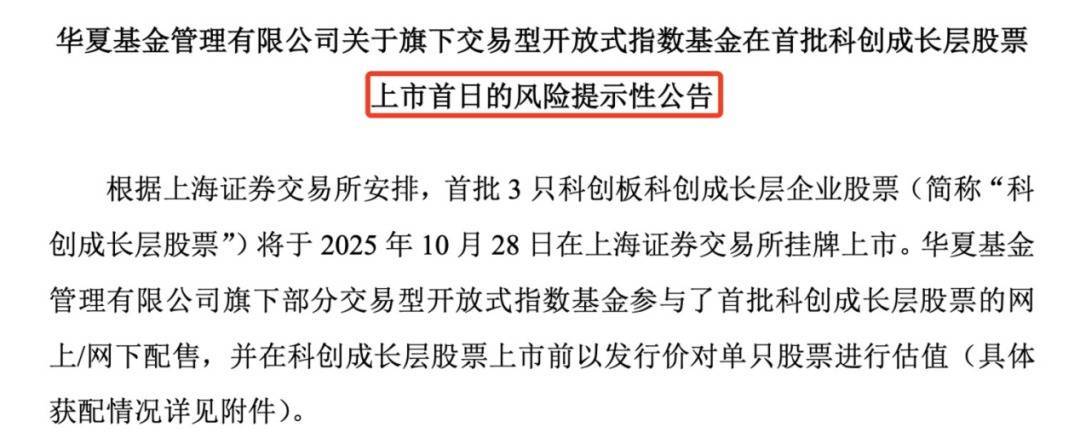 多只此前参与配售的ETF发布交易风险提示。华夏基金在风险提示性公告中称,华夏基金旗下部分ETF参与了首批科创成长层股票的网上/网下配售,并在科创成长层股票上市前以发行价对单只股票进行估值。