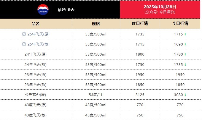 【大河财立方消息】10月28日,酒类行情监测平台“今日酒价”数据显示,2025年53度500ml飞天茅台散瓶批发参考价报1690元,较前一日下跌25元盛多网,首次跌破1700元/瓶大关,再创上市以来的新低;原箱报1715元,较前一日下跌20元。