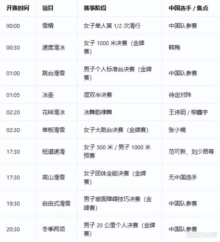 凌晨时段,雪橇、速度滑冰、跳台滑雪、花样滑冰、单板滑雪等项目先后展开,王诗玥 / 柳鑫宇出战冰舞韵律舞,张小楠冲击单板滑雪女子大跳台决赛奖牌,韩梅在速滑女子 1000 米赛场争牌。傍晚起,短道速滑迎来首个比赛日,中国队满额出战女子 500 米、男子 1000 米及混合团体接力,接力项目将决出短道首金,另有高山滑雪、自由式滑雪、冬季两项等金牌赛同步进行。